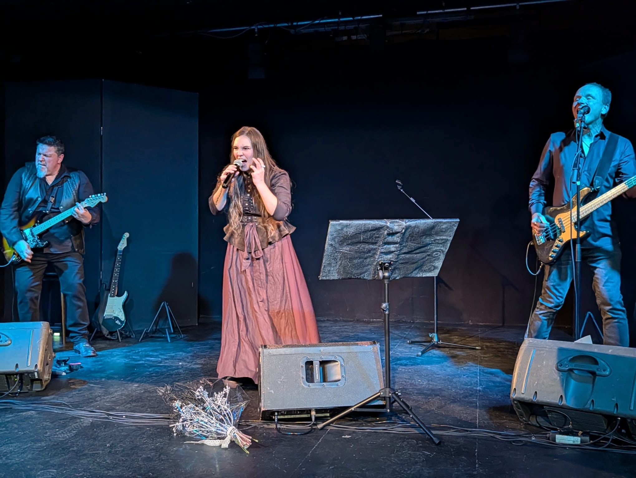 Auf dem dunkel gehaltenen Bild sieht man die drei Musiker der Band Schwarzes Edelweiss. Die Sängerin sowie die anderen beiden Musiker sind ganz in Schwarz gekleidet