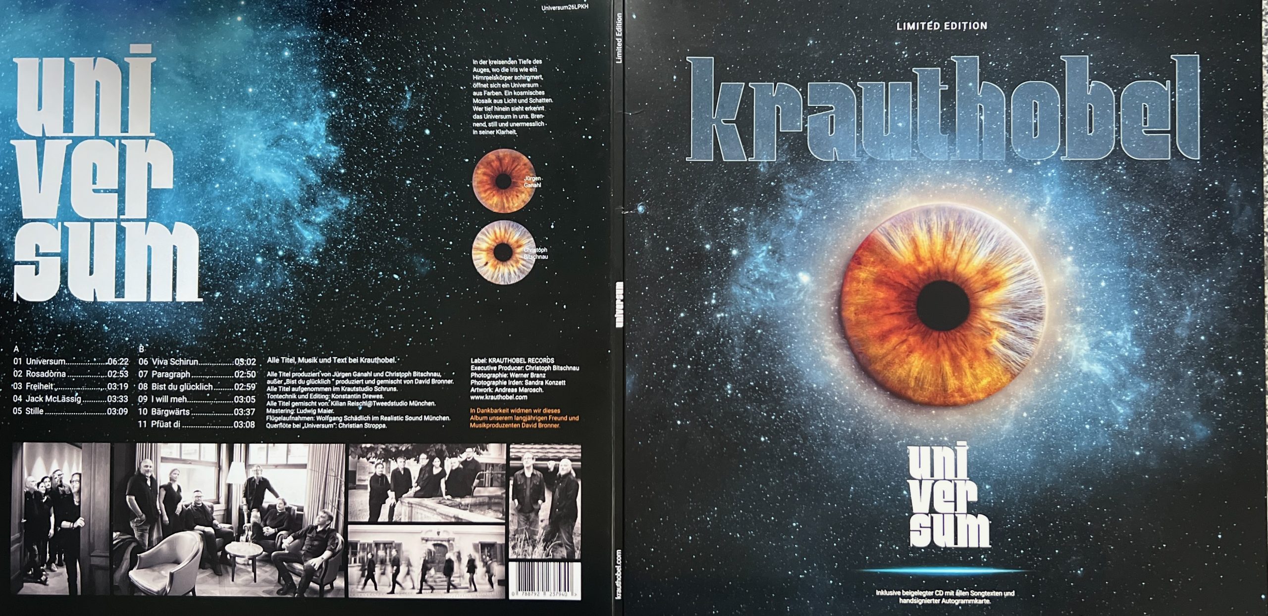 Krauthobel schreiben auf ihrer Homepage über ihr neues Album wie folgt: Mit „Universum“, dem mittlerweile elften Album, öffnet die Band ein klangliches Weltall, das vertraut wirkt und dennoch neue Facetten zeigt. Die Texte sind poetisch, ehrlich und lebensnah – mal tiefgründig, mal kraftvoll, immer jedoch geprägt von jener besonderen Authentizität, für die Krauthobel seit jeher steht. Musikalisch präsentiert sich die Band in Bestform: klare Linien, fein ausgearbeitet Arrangements und ein Sound, der unverkennbar ihre Handschrift trägt. „Universum“ ist weit mehr als eine Sammlung neuer Songs – es ist ein intensives, atmosphärisches Hörerlebnis, ein musikalischer Kosmos, in dem man sich gerne treiben lässt.
