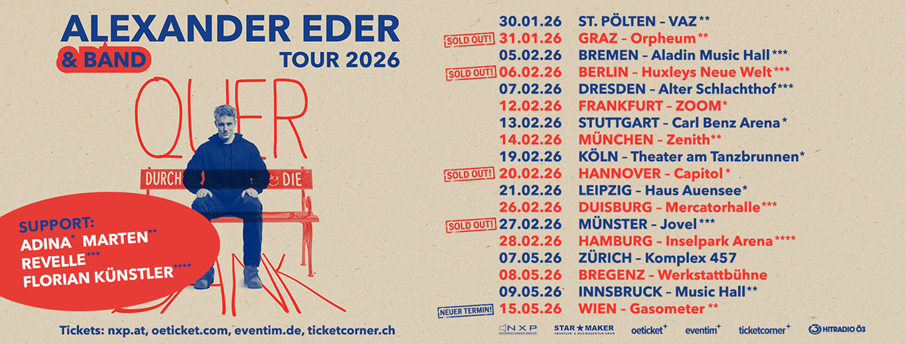 Alexander Eder & Band feiern das Leben in all seinen Facetten mit jedem Wort in jedem Song – mal emotional, mal wild und immer echt – imd verwandeln jede Bühne in einen Ort purer Energie und Gemeinschaft. Die Wartezeit ist vorbei. Alexander Eder & Band sind bereit, ihre mit Spannung erwartete Album-Tournee zu starten und die großen Bühnen mit ihrer Performance zum Zittern zu bringen.